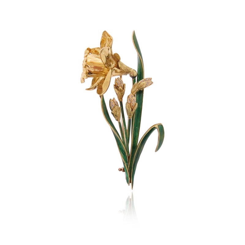 A diamond-set gold daffodil brooch, set with circular-cut diamond and with green enamel decoration in gold, 6cm high, case by Garrard