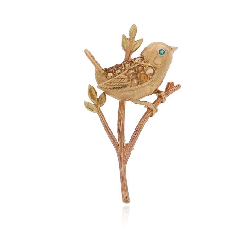 A gold bird brooch, the stylised bird set with citrines and an emerald eye on a bi-colour gold branch, 4cm high