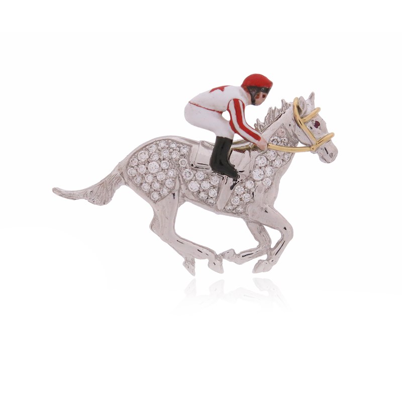 A diamond and enamel horse and jockey brooch, the stylised horse is pavé-set with diamonds, the jockey decorated with red and white enamel stripes, in platinum and gold, 4.8cm wide, case