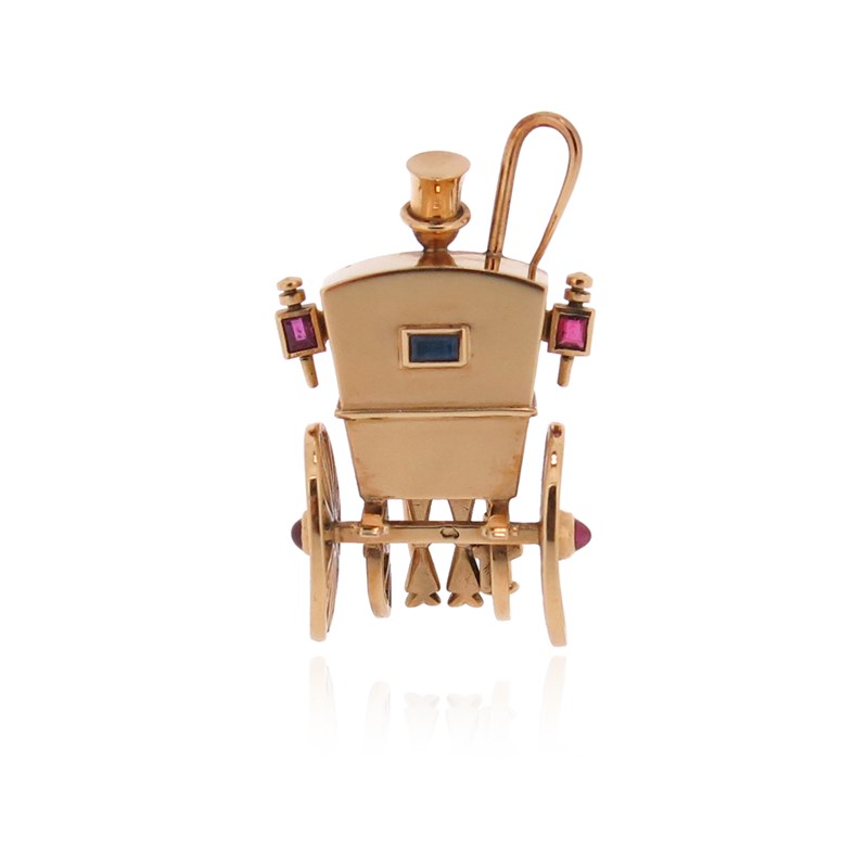 A gem-set gold horse and carriage brooch by Mellerio, the cart set with rubies and a sapphire in polished yellow gold, signed and numbered 2296Br, with maker's lozenge and French control marks, 3.4cm high