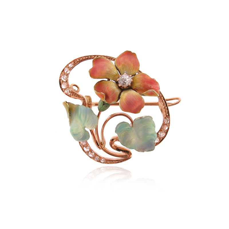 An Art Nouveau diamond-set flower brooch, centred with an old circular-cut diamond, with shaded polychrome enamel decoration, with further rose-cut diamonds to the border, 2.8cm wide