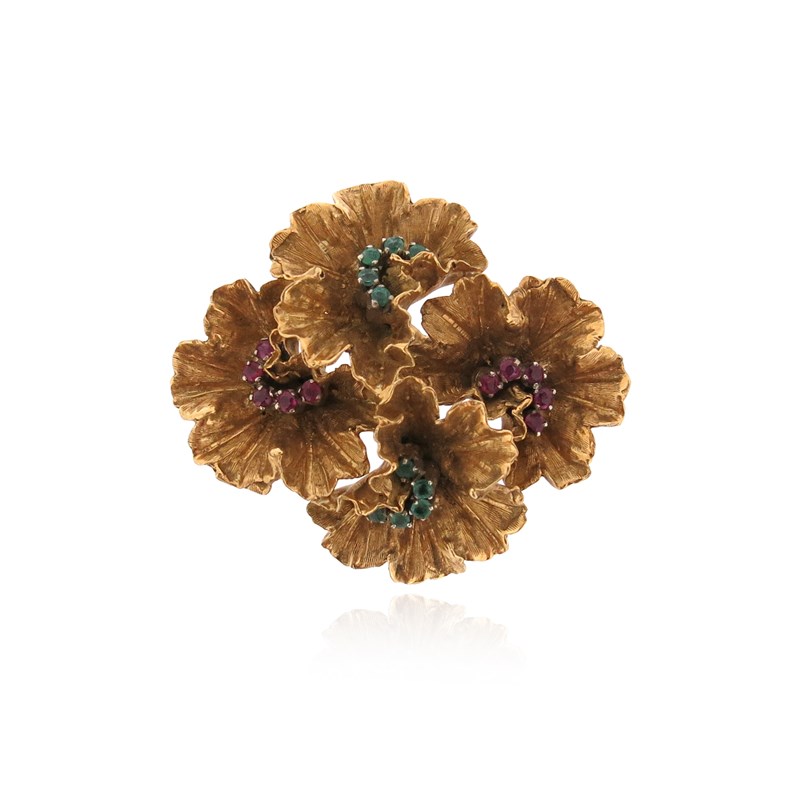 A gem-set gold foliate brooch, set with clusters of rubies and emeralds, 3.8cm wide, 13g