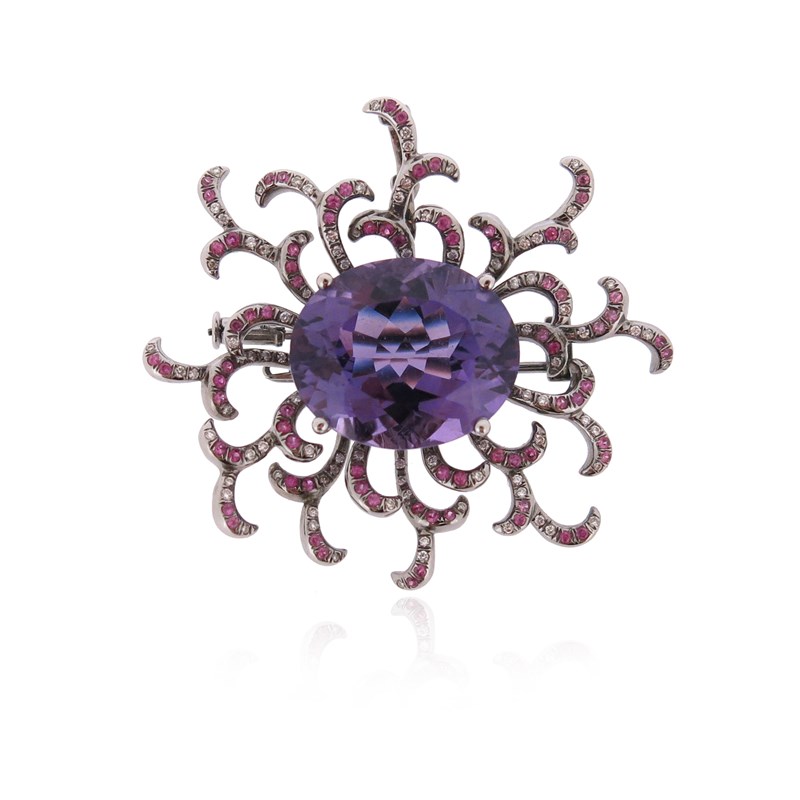 An amethyst pink sapphire and diamond-set scroll brooch pendant by Fei Liu