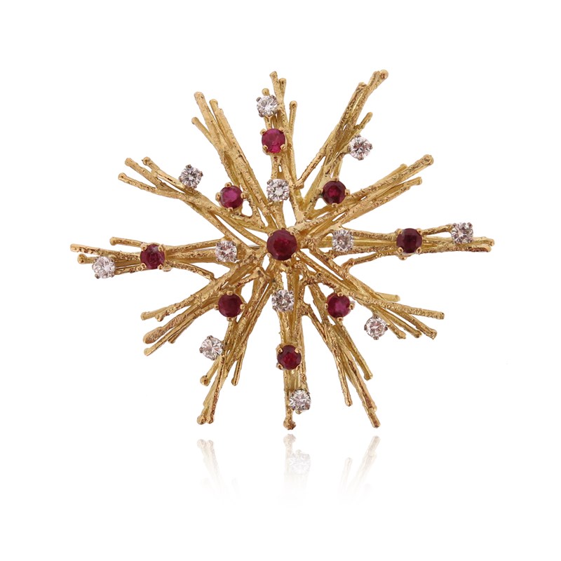 ‡ A ruby and diamond brooch by Andrew Grima, the stylised starburst set with graduated round brilliant-cut rubies and diamonds in textured 18ct yellow gold, with maker's plaque for Grima, maker's mark and London hallmarks for 1973, 6cm wide