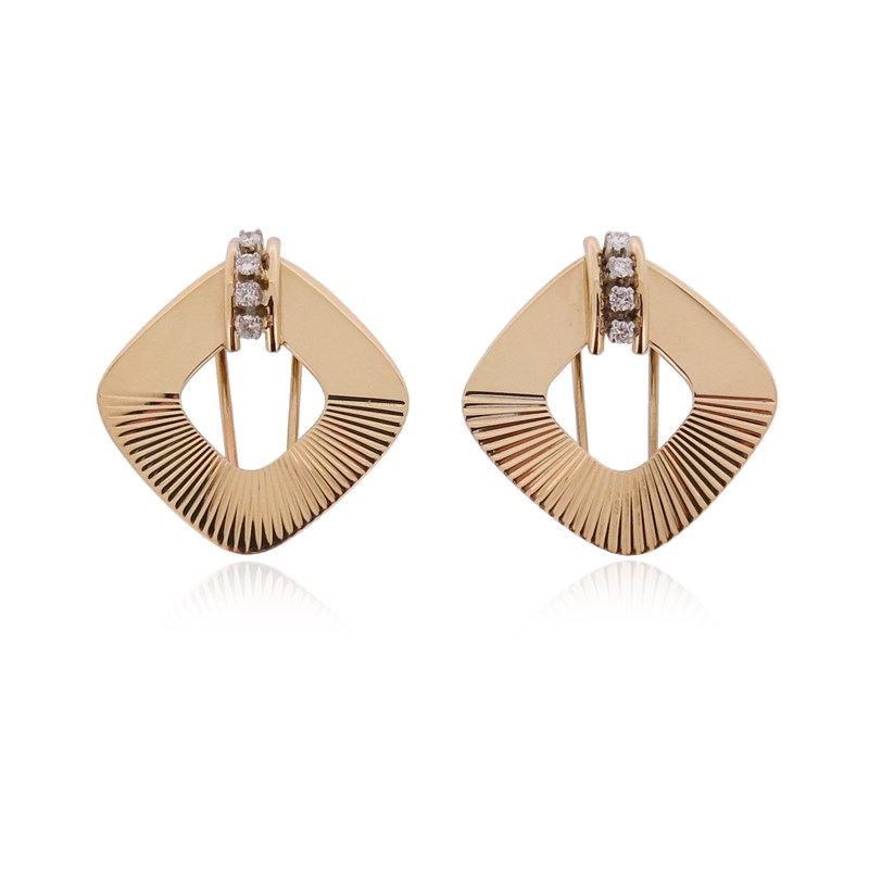 A pair of diamond and gold double clip brooches, c1940, the square clips with fluted decoration and a diamond surmount, set in 15ct gold, later modern hallmarks, 3.2cm high