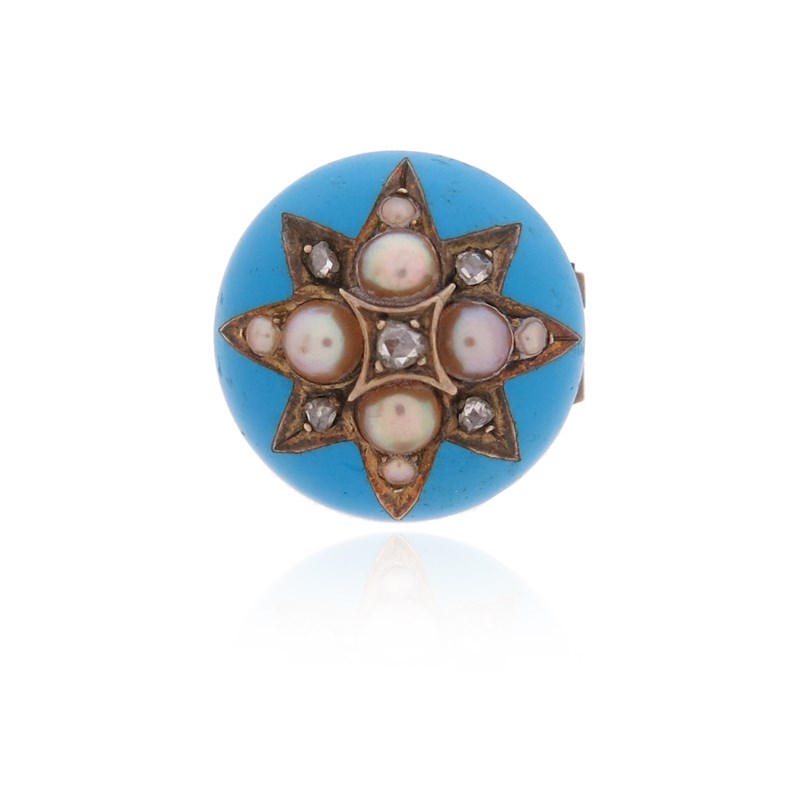 A Victorian diamond and seed pearl brooch, the star motif set with seed pearls and rose-cut diamonds with blue enamel decoration in gold, 18mm wide