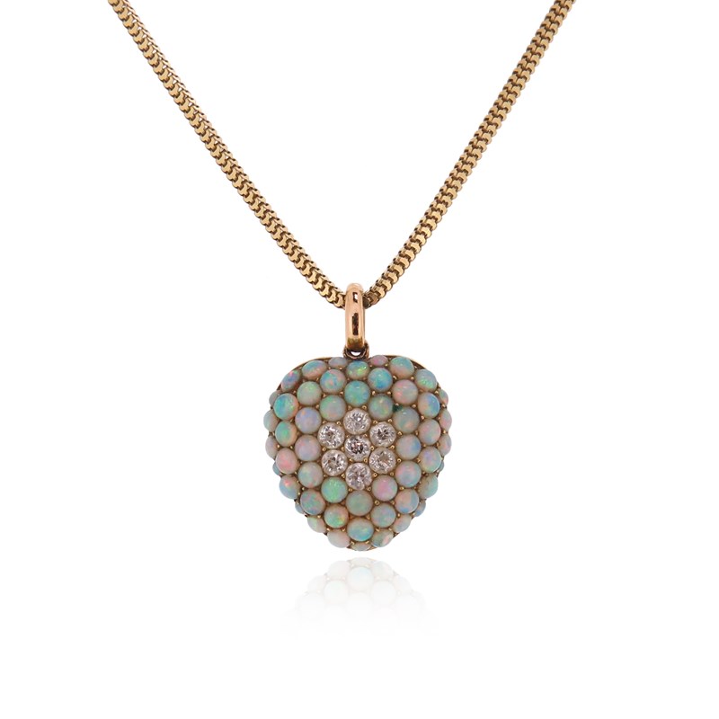 A Victorian opal and diamond heart pendant, pavé-set with opal cabochons and a cluster of old circular-cut diamonds in yellow gold, glazed locket compartment to reverse, 3cm high including bale, on a snake-link gold chain, 54cm long