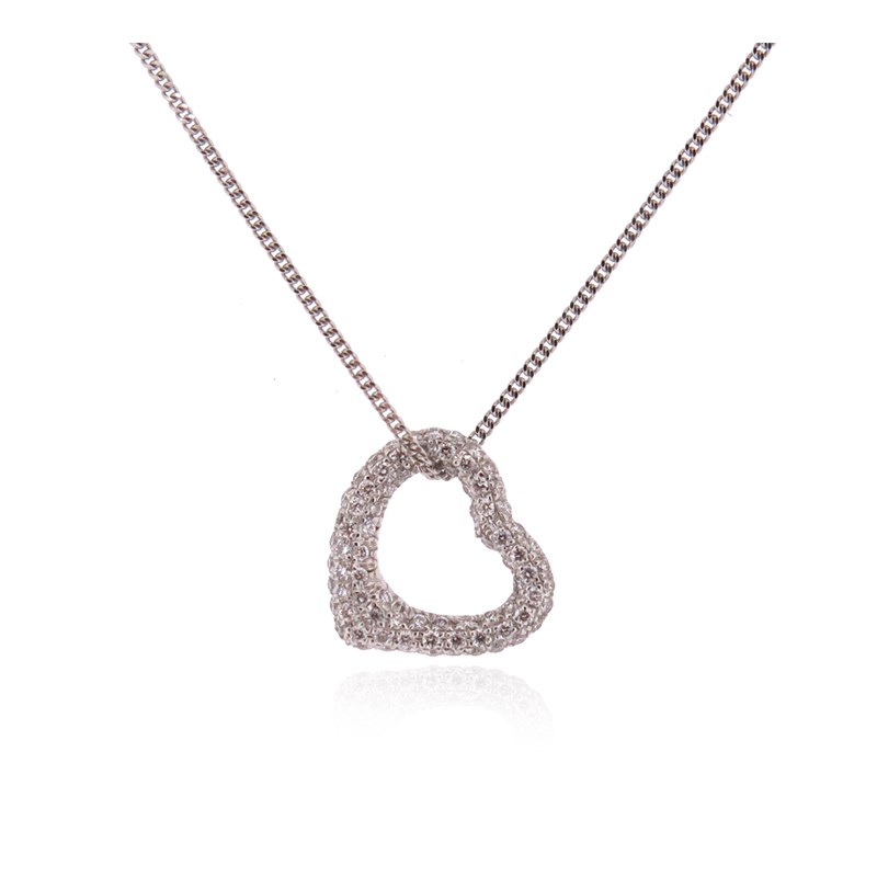 A diamond heart pendant, the stylised heart is pave-set with round brilliant-cut diamonds totalling approximately 0.35cts in white gold, on fine-link white gold neck chain, 44cm long