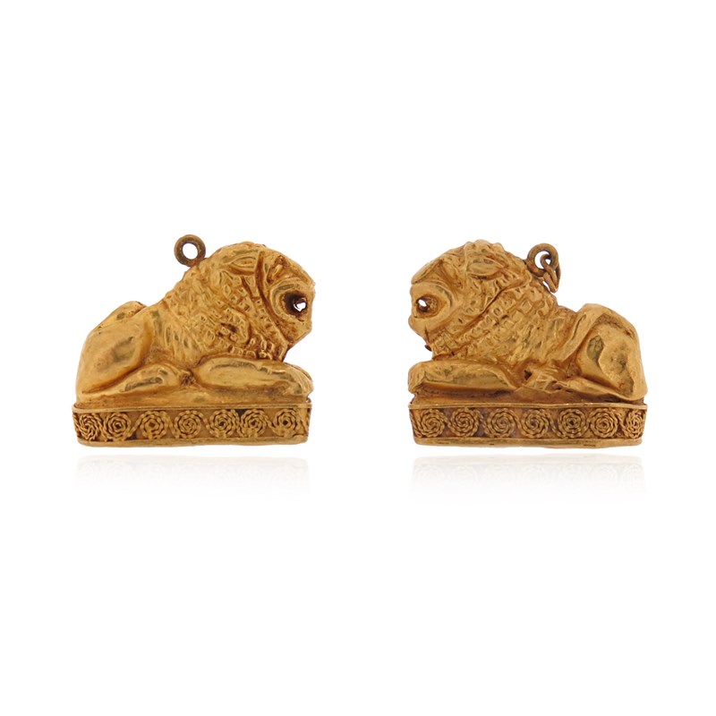 A pair of Etruscan style lion pendants, the stylised recumbent lions are sitting on a gold plinth with ropetwist border, 2.8cm wide
