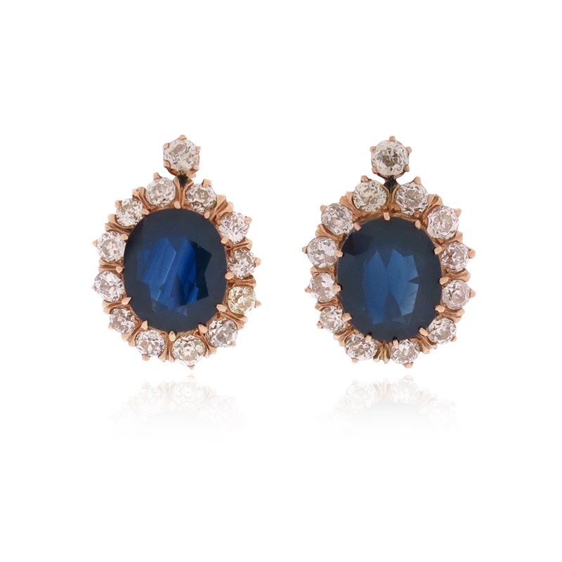 A pair of Russian sapphire and diamond cluster earrings, the oval-shaped sapphires set within a surround of old circular-cut diamonds in gold, initialed AT to reverse and 56 zolotnik, 2.1cm high