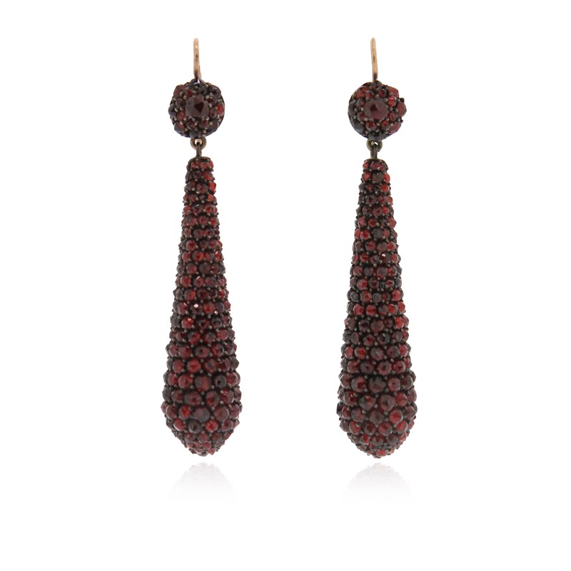 A pair of Victorian garnet drop earrings, the drop earrings pave-set with rose-cut garnets, suspended from a rose-cut garnet cluster in gold, shepherd's hook fittings, 6cm long (including hooks)