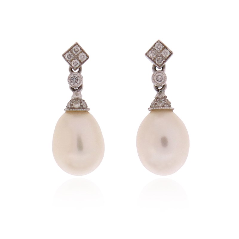 A pair of cultured pearl and diamond drop earrings, the cultured pearl drops suspend from circular-cut diamonds in white gold, 19mm long, case