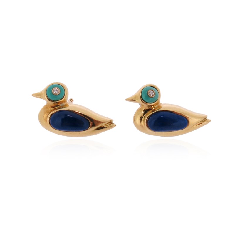 A pair of gem-set gold duck earrings, the stylised ducks set with a turquoise and diamond head and a lapis lazuli cabochon body in yellow gold, maker's mark LB post fittings, 1.7cm wide