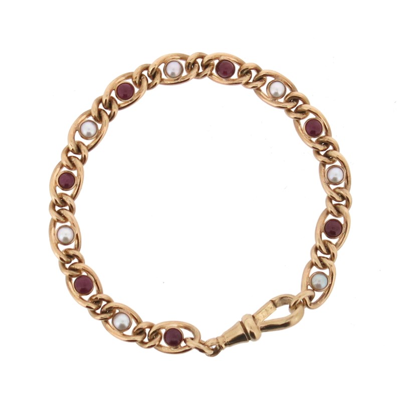A gem-set gold bracelet, set with cabochon rubies and half pearls in 9ct gold, 19cm long, 18g