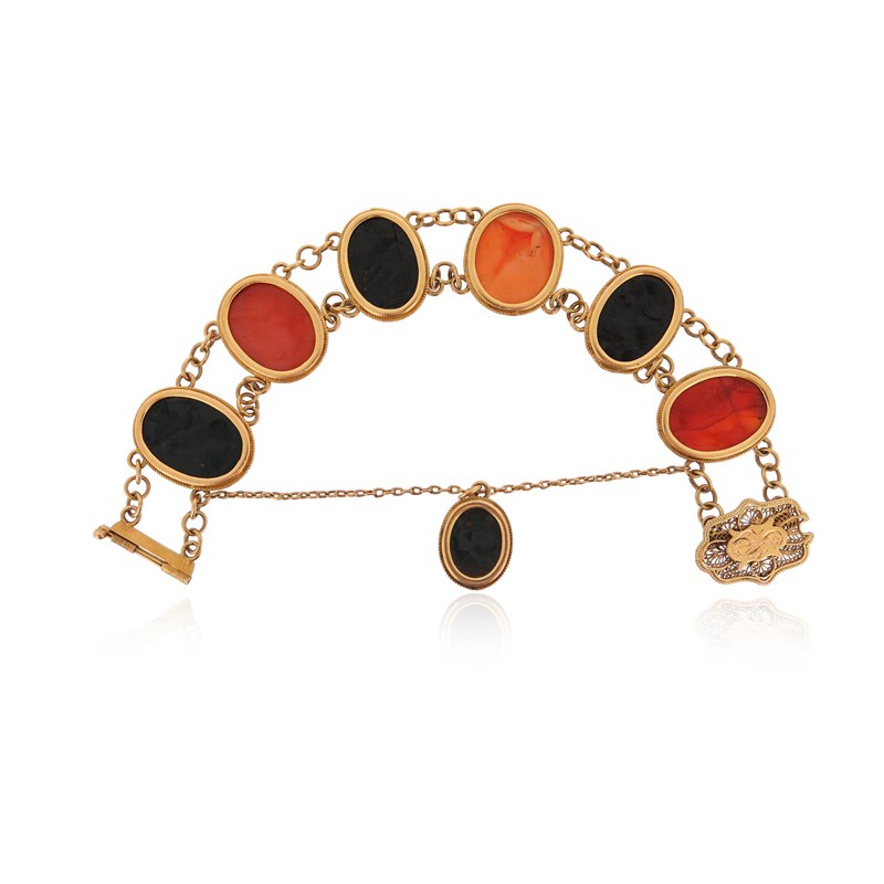 A gold bracelet mounted with intaglios, the seven intaglios depict assorted classical oval profiles including a gryllus, 1.3 - 2.1cm high, each mounted in gold and joined with a simple chain link and with a filigree gold clasp, 21cm long