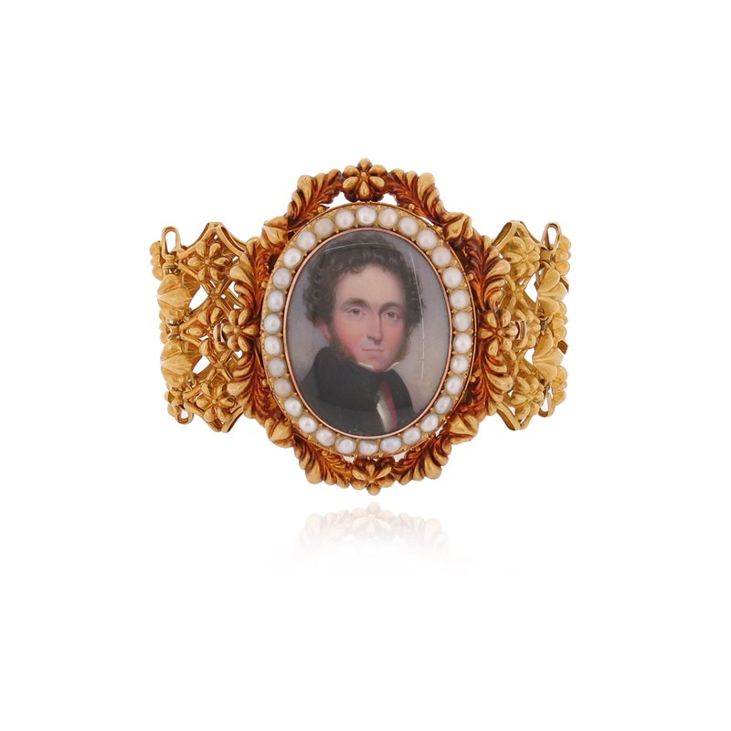 A Victorian gold miniature bracelet, the repoussé gold bracelet with a seed pearl and gold detachable clasp set with a portrait miniature of a gentleman, in glazed compartment with hair to the locket interior, 18.5cm long, miniature frame 5.8cm high