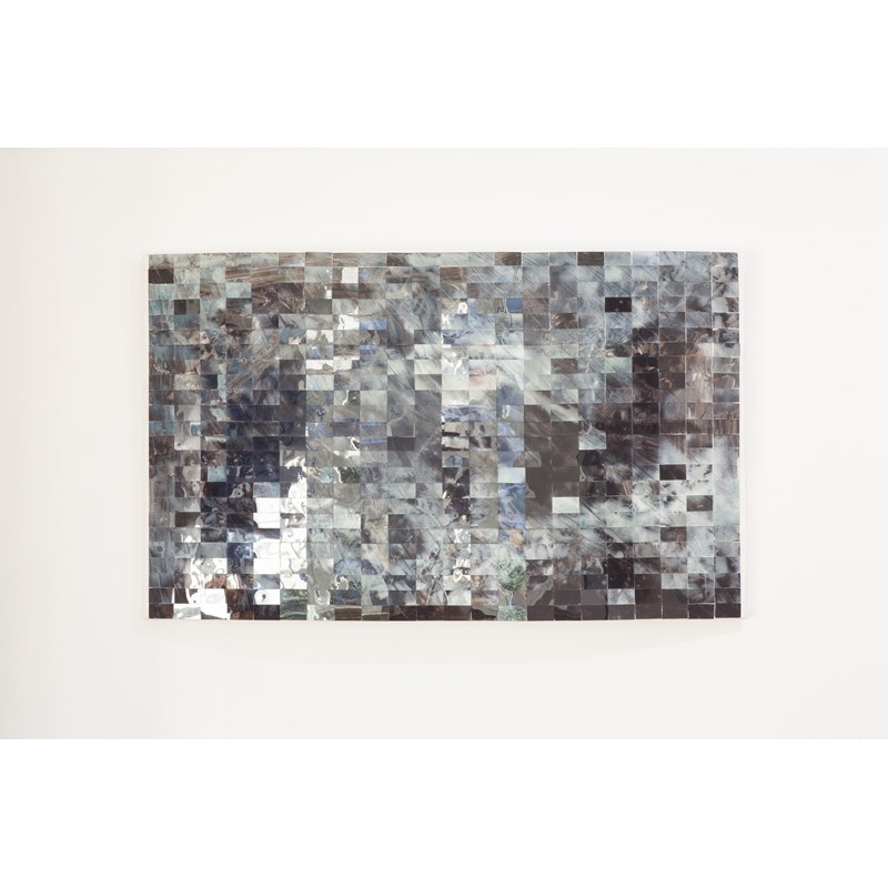 Description of the work: Vermeer are a series of curved reliefs whose reflective glass surface refracts the environment so that the viewer's perception switches between examining the image and the reflection. A painted response with glass enamels which are fired onto glass, cut up and collaged onto a curved timber frame which emphasizes the pixilated image. It is a system which questions what we see and how we see.