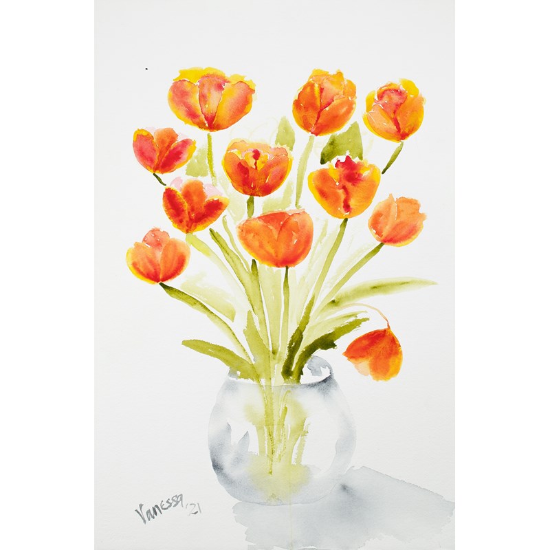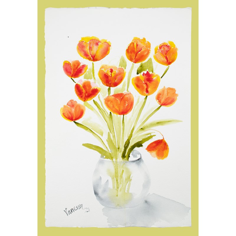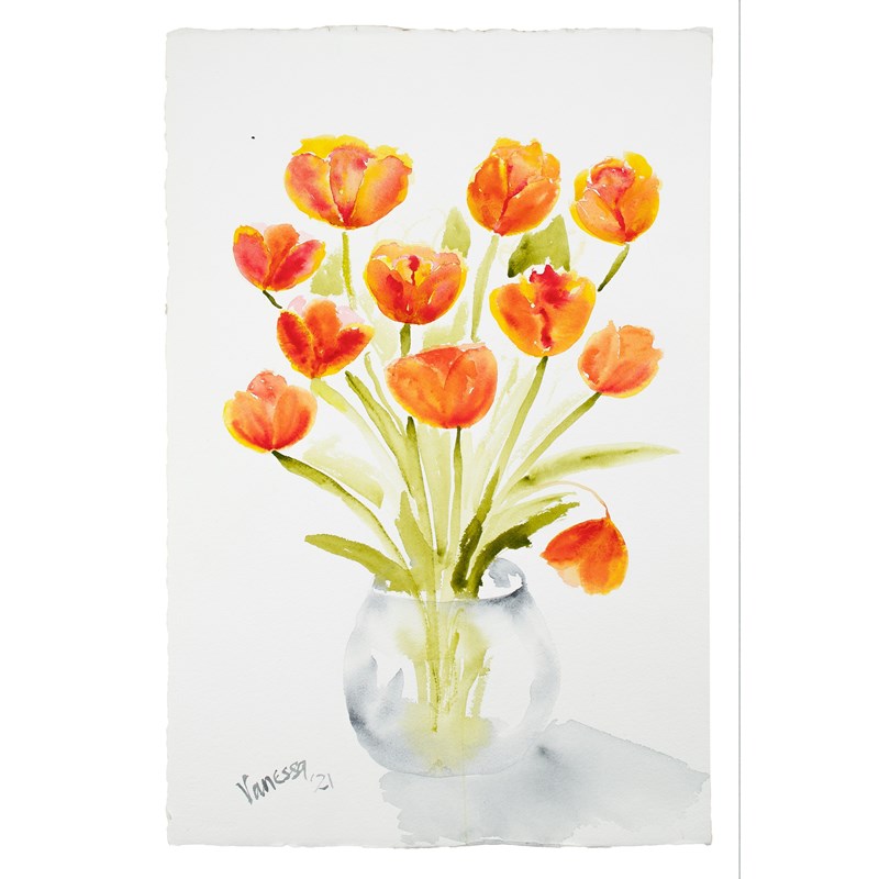 Vanessa Haarhoff grew up in Zimbabwe but it was while studying for a BSc in Human Movement Sciences in South Africa that she suffered a spinal injury, resulting in tetraplegia. During rehabilitation in a South African spinal unit Vanessa began to paint by holding a brush in her mouth. Her efforts were submitted to the Mouth & Foot Painting Artists who accepted Vanessa as a Student Artist. Alongside developing her art, she returned to Rhodes University to study journalism and politics. She lived and worked in Zimbabwe, South Africa and Zambia as a journalist and enjoyed painting the unique nature and landscapes. After relocating to the UK Vanessa continued her studies, changing courses to read an MSc in International Development at the University of Bristol and became involved with the British Mouth & Foot Painting Artists.