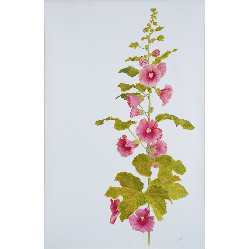 This study of a Hollyhock is painted in oils on parchment and was painted using a subject so tall that it touched the roof of her studio. Katy paints from life wherever possible as she feels that the final painting conveys the character, structure and stature of the plant so wonderfully, but that this approach also offers its challenges as flowers insist on continuing to blooming as they are painted. She often finds herself painting into the night to finish botanical studies before her flowers change beyond recognition.