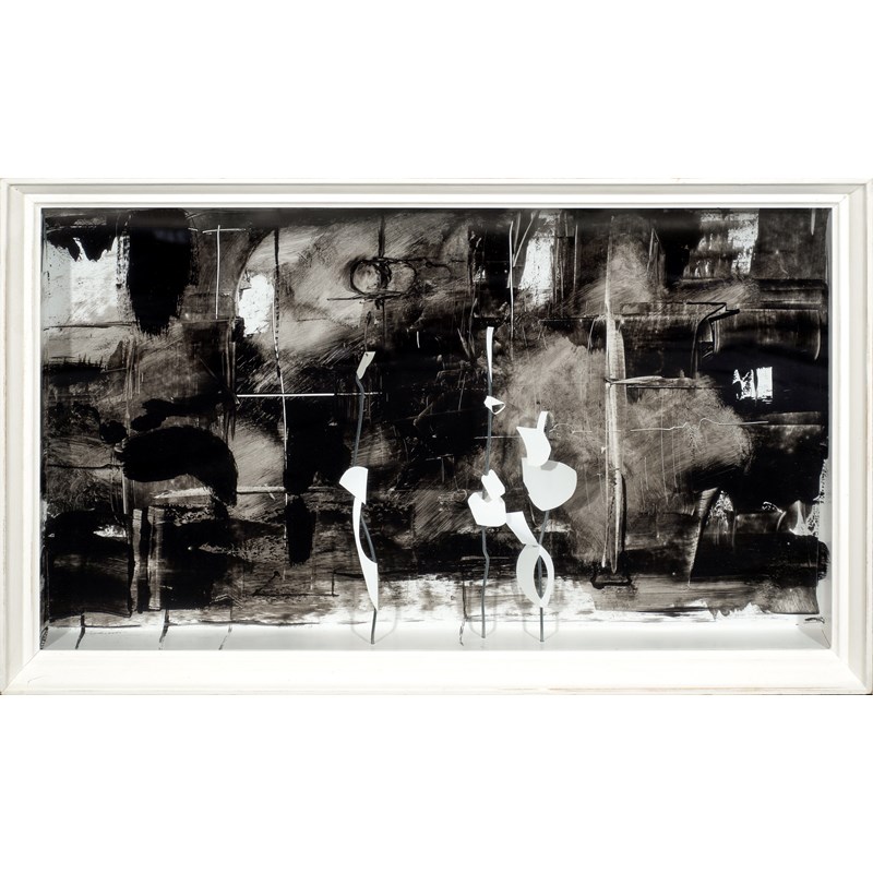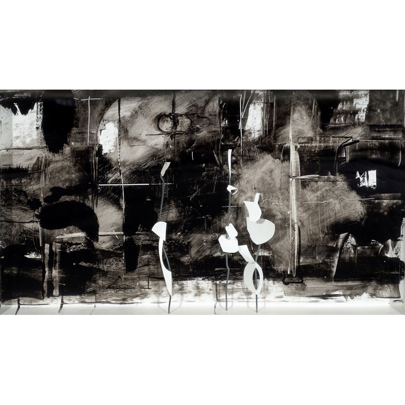 White card and steel against a painted backdrop and within an integral white wooden frame