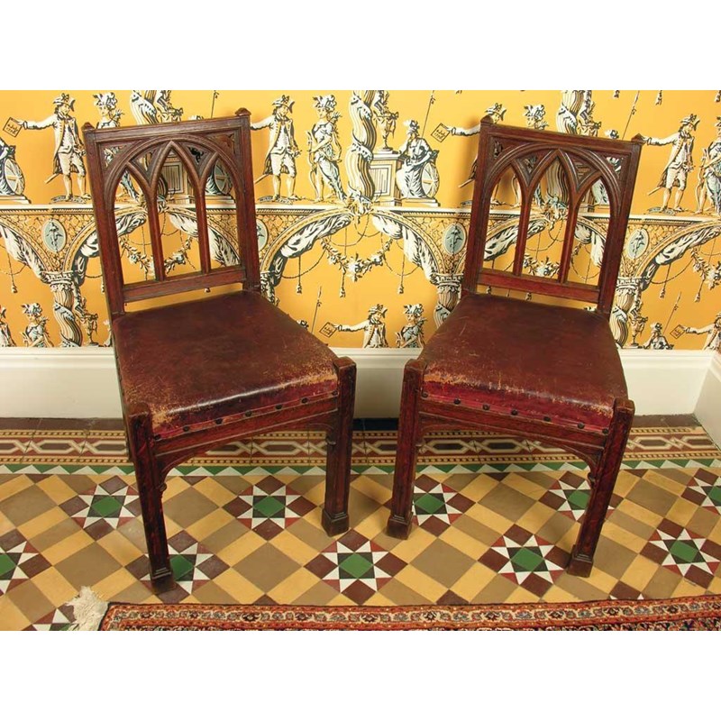 A pair of late Regency Gothic oak hall chairs, with moulded arch and pierced back, the later leather upholstered seat on square moulded legs and brackets on block feet. (2) Literature: Francis Collard, Regency Furniture, p.190 for a similar chair after a design by George Smith, Household Furniture, 1808, pl.37.