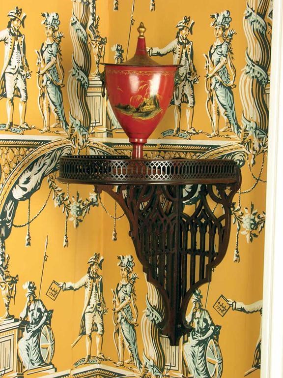 A pair of scarlet and gilt tole chestnut urns and covers, decorated with oriental landscapes and floral sprays, lions mask ring handles, 31cm (12.25in) high. (2)