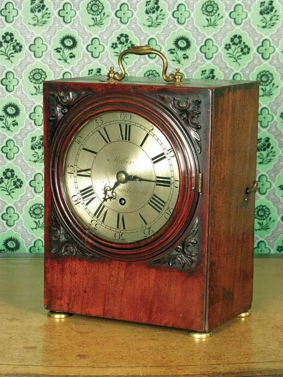 A George II mahogany table clock, the single fuse movement, with a verge escapement and a bob pendulum, the circular shield dial inscribed 'Miller Lombard street,' the hinged moulded bezel and glazed door to leafage spandrels, a brass re-positioned carrying handle, on bun feet, 32.5cm (12.75in) high. James Miller is recorded as working in London in 1758.