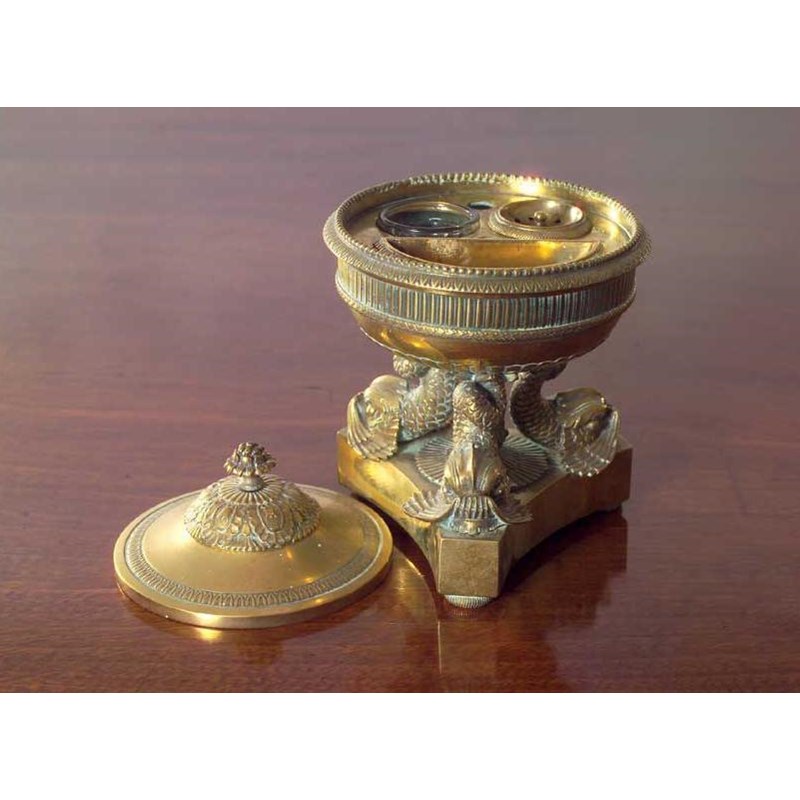 A 19th century brass inkstand the cover enclosing a fitted interior, on central leaf mounted stem flanked by three dolphins on triform base, 16cm (6.25in) high.