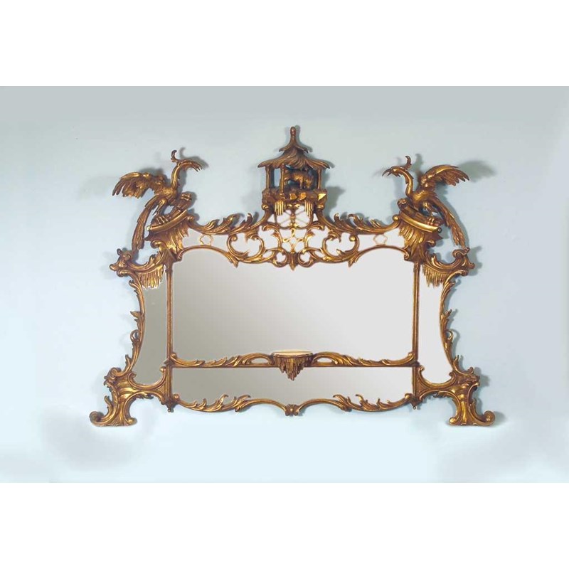 A 19th century giltwood and gesso overmantel mirror, the pagoda surmount with a goat flanked by a pair of ho-ho birds, the scroll and rocaille frame with a central bracket, 107 x 145cm (42 x 57in).