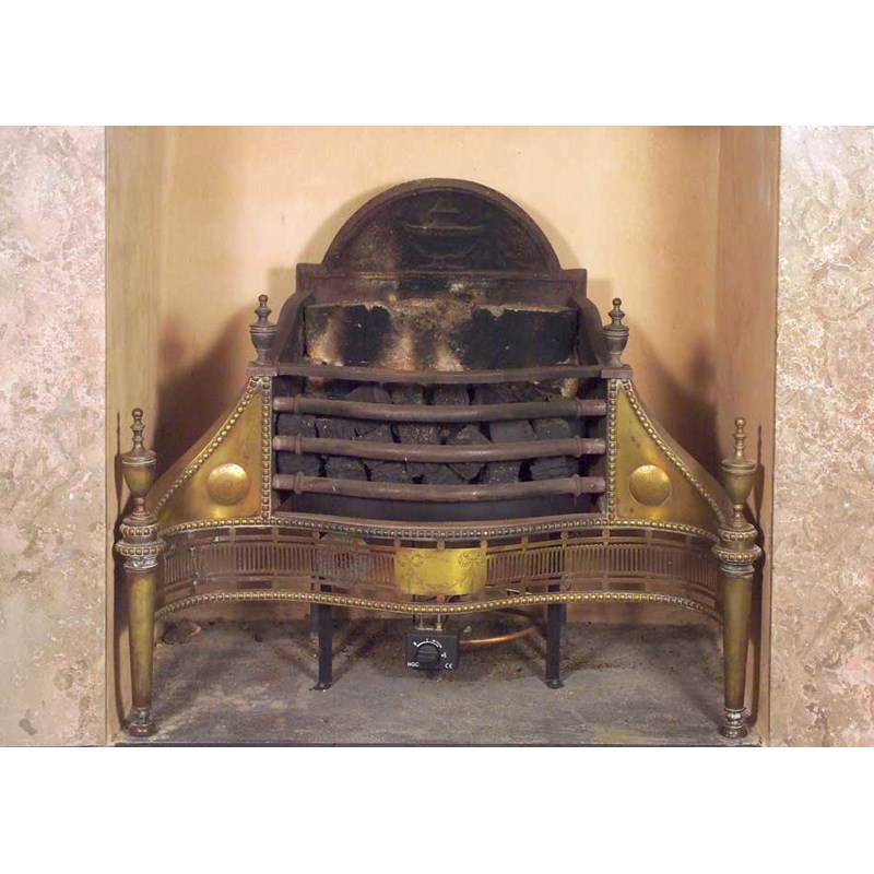 A George III style brass serpentine front fire grate, the arched cast iron back with an urn, having a bar front, engraved and pierced decoration and urn finials, 68.5cm (27in) high, 84cm (33in) wide, 40.5cm (16in) deep.