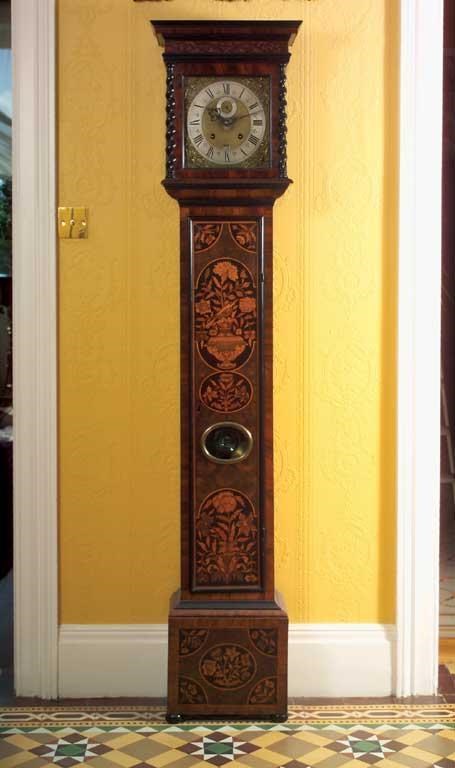 A late 17th century oyster veneered and marquetry inlaid longcase clock, the month going movement striking on a bell with latched pillars, the 10in square brass dial with silvered chapter ring, subsidiary seconds dial and date aperture, the matt centre engraved with a flower head, with pierced steel hands and cast gilt brass hinged cherubs head spandrels, the base inscribed 'Ed Appley att charing crofs,' the rising hood with a fabric back pierced frieze and ebonised twist pilasters, the trunk door with ebonised ground marquetry panels, sycamore banded sides on ebonised ball feet, 192.5cm (75.75in) high. Edmund Appley was working in London 1677-1693. Provenance: Purchased from Anthony Woodburn Ltd.