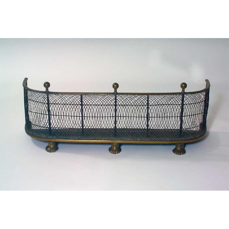 A 19th century brass and wirework fender with ball finials and paw feet