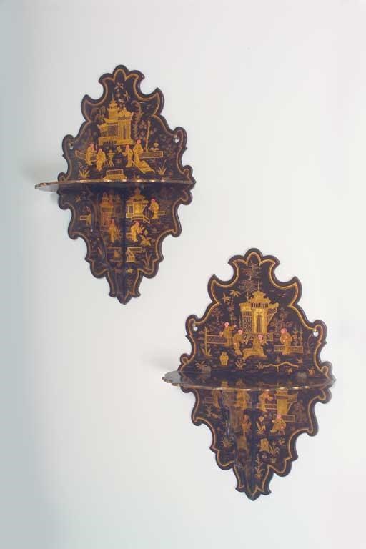 A pair of 19th century papier mach folding wall brackets with Chinoiserie gilt and pink decoration