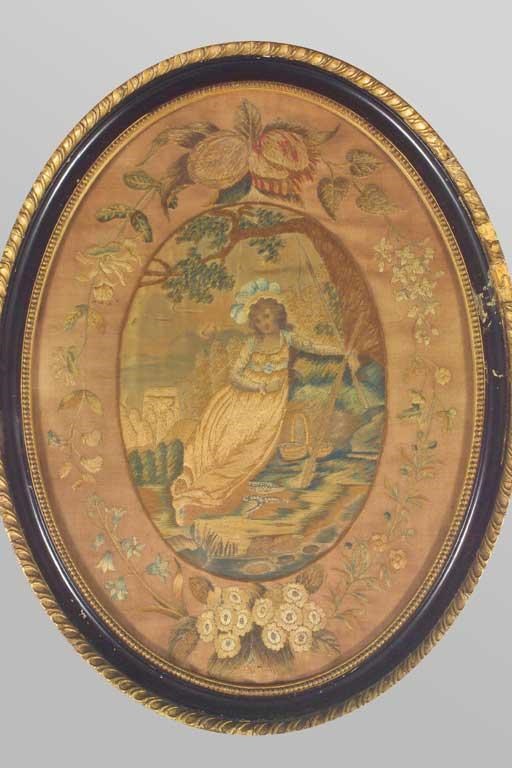 A 19th century oval woolwork and silk picture depicting a lady and a cat seated by a brazier, within a floral border and another similar depicting a lady fishing, 38 x 28cm (15 x 11in). (2)