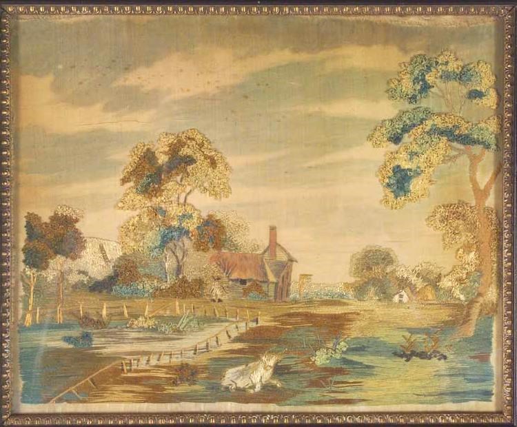 A pair of 19th century woolwork and silk pictures depicting pastoral scenes