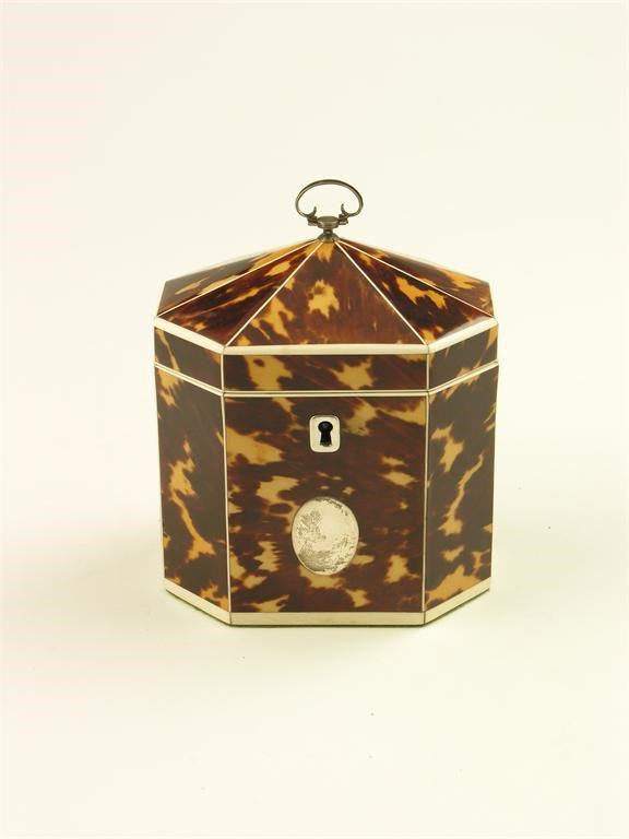 A George III tortoiseshell and ivory strung octagonal tea caddy, the front with applied oval silver vacant plaque, the hinged tent top with silver loop handle, the inner tortoiseshell lid with turned ivory handle, 13cm (5in) high, 10.5cm (4.25in) wide.