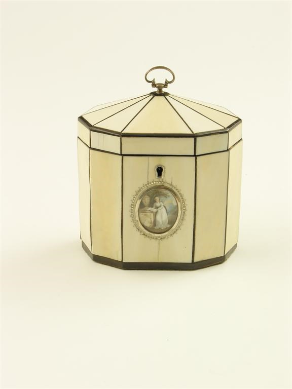 A George III ivory and tortoiseshell strung decagonal tea caddy, the front with an oval miniature of a lady standing by an urn within a silver dot border, the hinged tent top with silver loop handle, the tortoiseshell inner lid with ivory handle, 13.5cm (5.25in) high, 10cm (4in) wide.