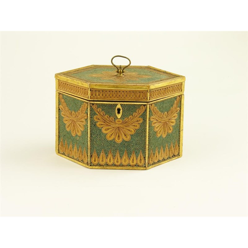 A George III rolled paper hexagonal tea caddy, the panels decorated with gilt swag tear drops within a green ground, the hinged top with a brass loop handle, the inner lid with yewwood oval panel and turned ivory handle with a divided interior, 15cm (6in) high, 18.5cm (7.25in) wide.