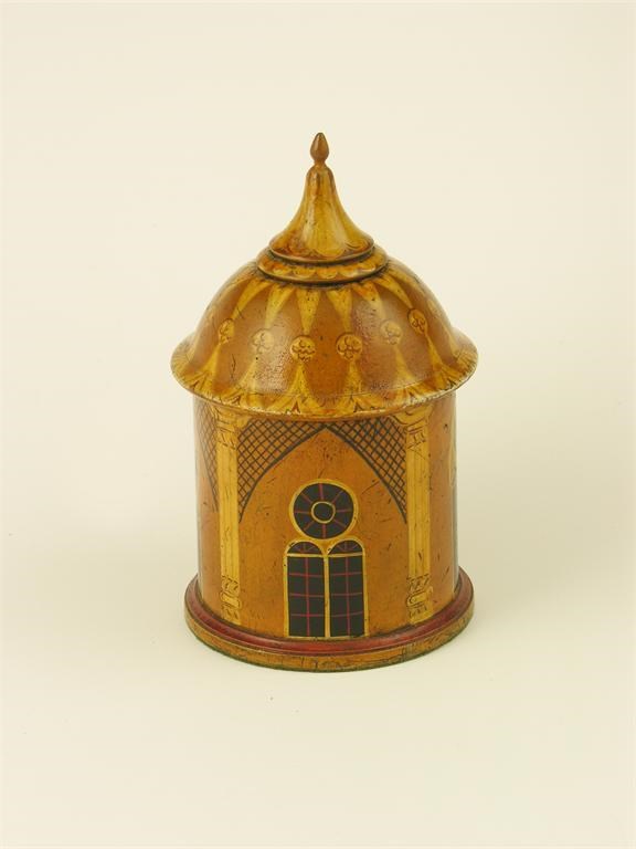 An early 19th century painted caddy, in the form of pagoda top summer house, 19cm (7.5in) high, 11.5cm (4.5in) diameter.
