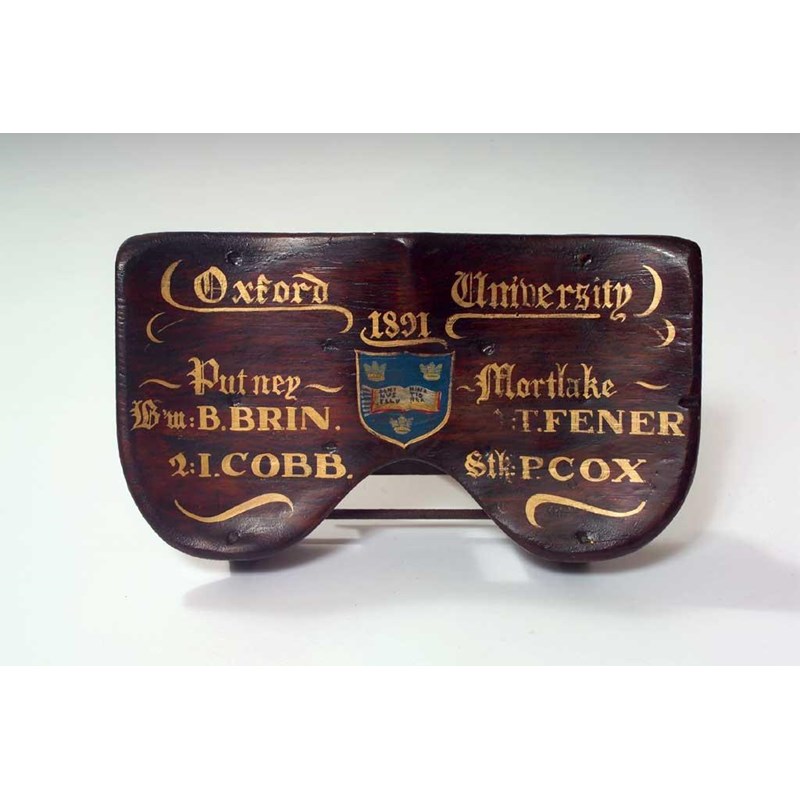 A wooden rowing seat painted with a crest and inscribed 'Oxford University 1891 Putney Mortlake', with the names of four oarsmen, 33cm (13in) wide.