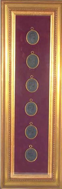 Twelve Wedgwood oval black basalt portrait medallions of Roman Emperors mounted and glazed in two frames, each medallion approx. 5cm (2in) high.