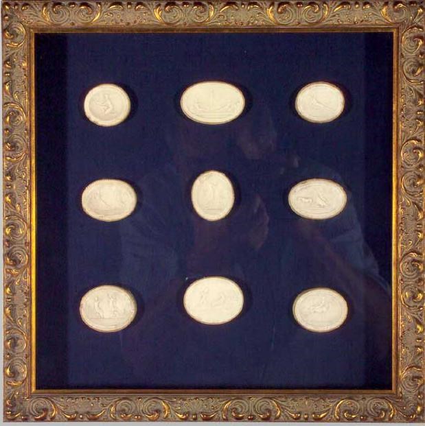 Nine oval grand tour plaster intaglios depicting classical and allegorical figures, framed and glazed, overall 34cm (13.5in) square, and three others similar (36 medallions in total). (4)