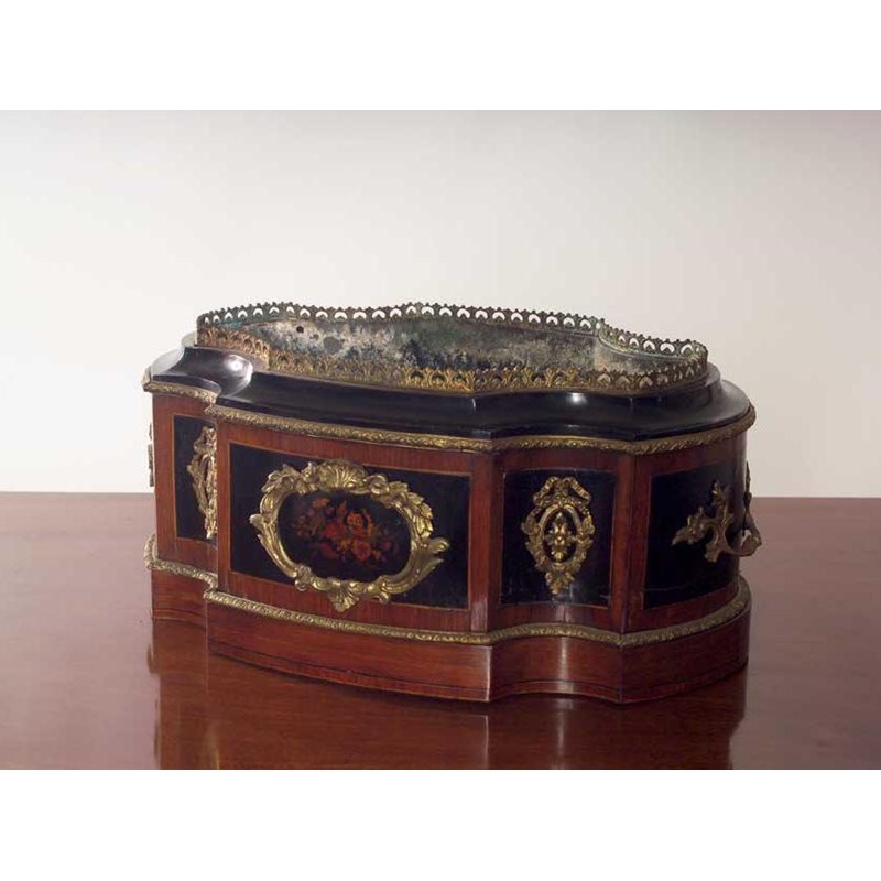 A late 19th century French kingwood, ebonised and floral marquetry inlaid jardiniere, of shaped outline with concave corners, having gilt brass mounts and a zinc liner, 23cm (9in) igh, 47cm (18.5in) wide, 34cm (13.5in) deep.