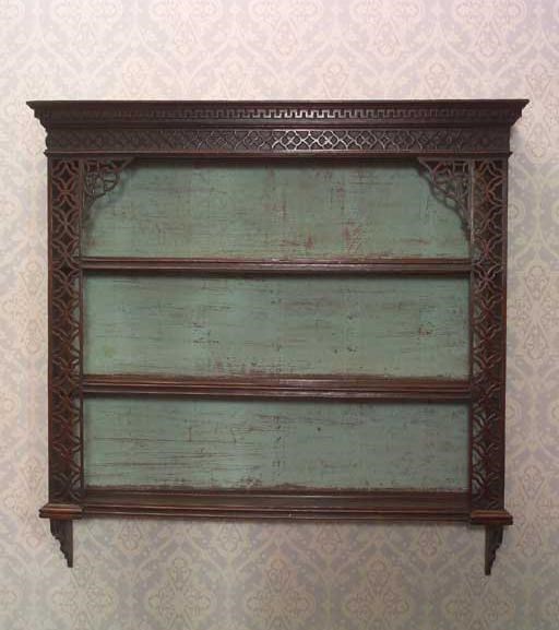 A George III oak set of hanging shelves, the moulded key cornice above a blind fret frieze and three shelves with moulded fronts and pierced fret sides and brackets, with base mouldings and pierced bracket supports, the back later and the sides built up, 185cm (42.75in) high, 109cm (43in) wide, 20.3cm (8in) deep.