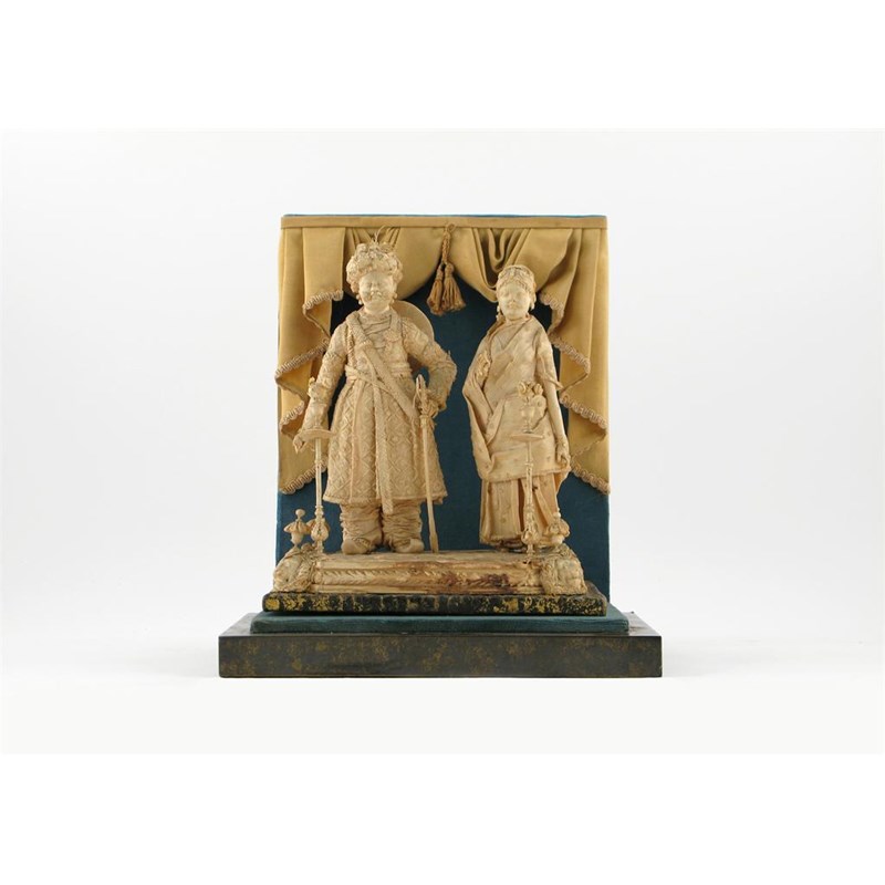 A balsa wood group of a Maharaja and Maharani standing on a cushioned base with lions head corners
