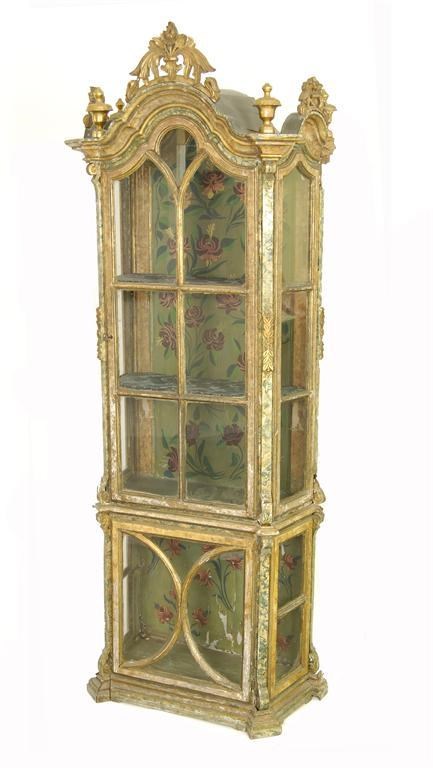 A Venetian polychrome decorated dwarf display cabinet, in two parts with glazed tracery doors, 179cm (70.5in) high.