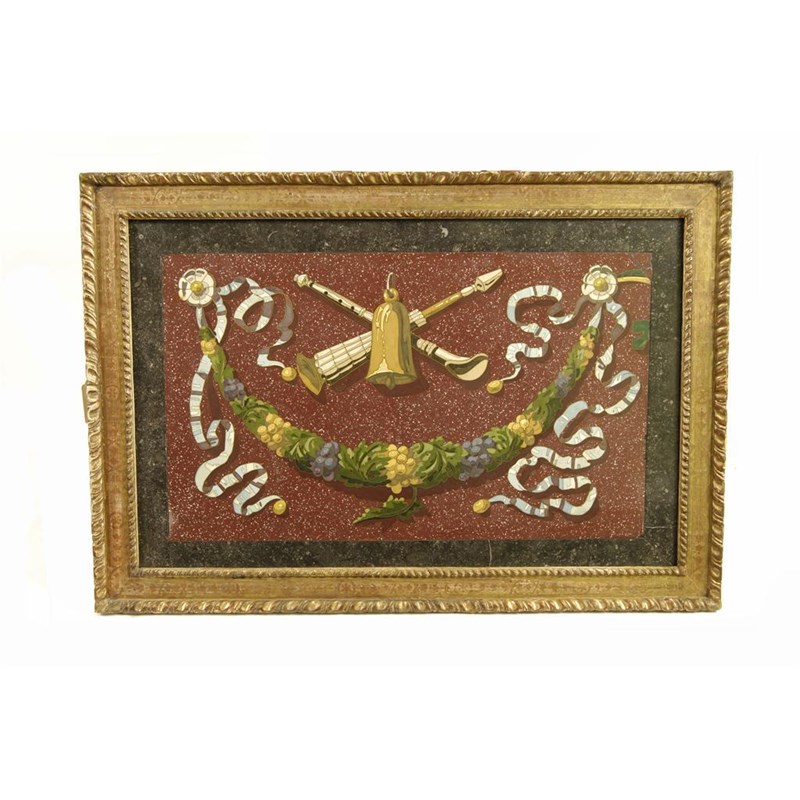 An Italian pietra dura panel, decorated with a bell, musical trophies, ribbands and vine swag, 44.5cm (17.5in) x 68.5cm (27in).