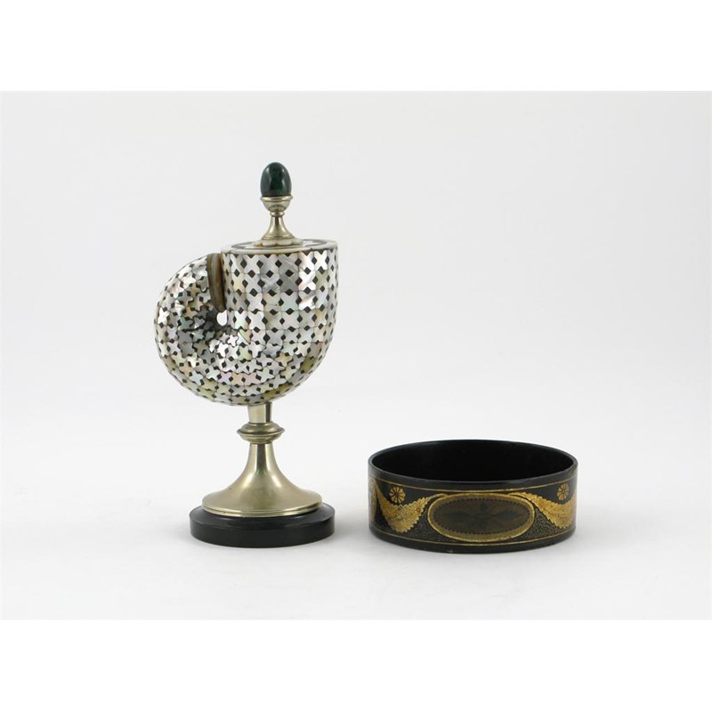 A papier maché coaster, gilt decorated with leaf swags and panels, 5.25cm (13.5in) diameter and a mother of pearl cornucopia with malachite finial and plated stem, 24.5cm (9.5in) high. (2)
