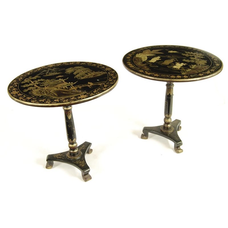 A pair of Chinese lacquer and gilt circular tilt top tables