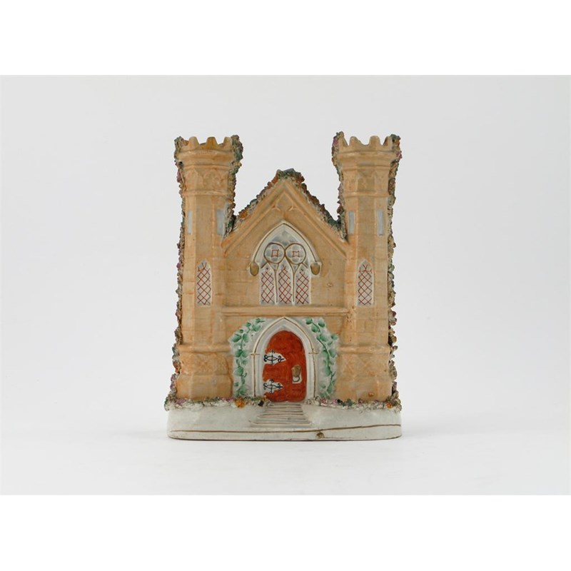 A Staffordshire flatback group of a crenulated castle, 23cm (9in) high.